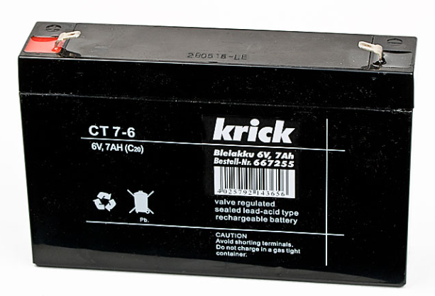 Wartungsfreier Bleiakku. Lageunabhängiger Einbau problemlos möglich. Anschluss über Flachstecker.
