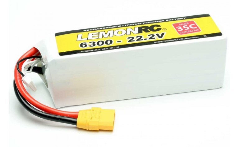 LiPo Akku LEMONRC 6300 - 22.2V (35C) LEMONRC LiPo Akkus zählen seit über 15 Jahren zu den meistverkauften Lithium-Polymer Akkus. Dabei wurden die Marke LEMONRC im Hinblick auf Leistung und Lebensdauer ständig mit Hilfe neuester Technologien weiterentwickelt. Mit einer Dauerbelastbarkeit von bis zu 35C (70C Kurzzeit) bieten LEMONRC XT LiPo Akkus genügend Leistungsreserven für fast alle Anwendungen im R/C Modellsport. LEMONRC XT LiPo Akkus sind mit den bewährten XT Steckern ausgestattet. Adapterkabel für andere Steckersysteme sind bei uns erhältlich. Produktmerkmale * Niedriger Innenwiderstand für hohe Belastbarkeit * Kompakte Bauformen und perfekte Verarbeitung * Speziell entwickelt für den R/C Modellsport * Streng selektierte Top-Qualität * Frische Ware aus neuester Produktion * 30-Punkte Qualitäts Check Technische Daten Kapazität = 6300mAh Spannung = 22,2V Energie (Wattstunden ) = 139,86 Wh Konfiguration = 6S1P Belastung Dauer max. = 220,5 A (35C) Belastung Kurzzeit max. = 441 A (70C) Abmessungen (LxBxH) = 157x45x55 mm Gewicht mit Kabeln = 841g Stecker = XT90 + Balancer XH