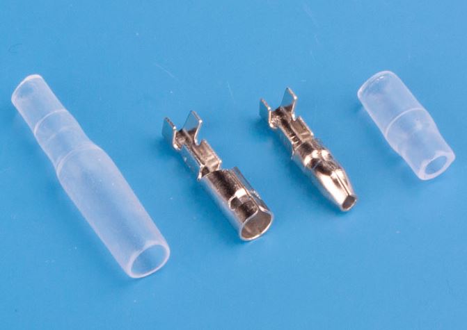Je 10 Stecker und Buchsen mit Kunststoff-Isolierung. Die Metallteile können an Kabel wahlweise gecrimpt oder gelötet werden.