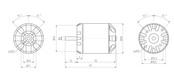 Stromversorgung LiXX Zellen: 2 - 4 ; Umdrehungen pro Volt [U/min/Volt]: 915 ; Max. Leistung (30 s/4S LiPo) [W]: 220 ; Leerlaufstrom (2S) [mA]: 700 ; Max. Spitzenstrom (30 s) [A]: 20 ; Durchmesser [mm]: 27.8 ; Länge [mm]: 37 ; Wellendurchmesser [mm]: 4