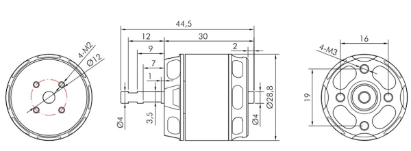 Motoreinbau: KAVAN PRO 2830-900 wurde sowohl für die Front- als auch für die Radialmontage entwickelt. Frontmontage: Verwenden Sie mindestens zwei (gegenüberliegende) oder vier M3-Schrauben; diese dürfen nicht tiefer als 3-4 mm in das Frontgehäuse eintauchen. Radiale Montage: Verwenden Sie vier M3-Schrauben, um das Montagekreuz an dem Motorspant zu befestigen. Der Motorspant sollte aus 2,0 mm Sperrholz bestehen. Das radiale Montageset wird mit dem Motor geliefert.