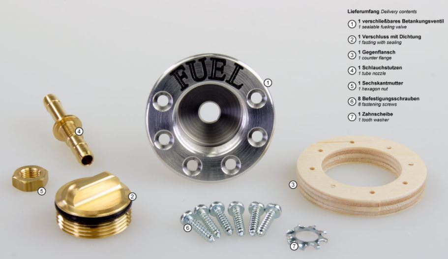 1 verschließbares Betankungsventil FUEL, 1 Verschluss mit Dichtung, 1 Gegenflansch, 1 Schlauchstutzen, 1 Sechskantmutter, 8 Befestigungsschrauben und 1 Zahnscheibe.