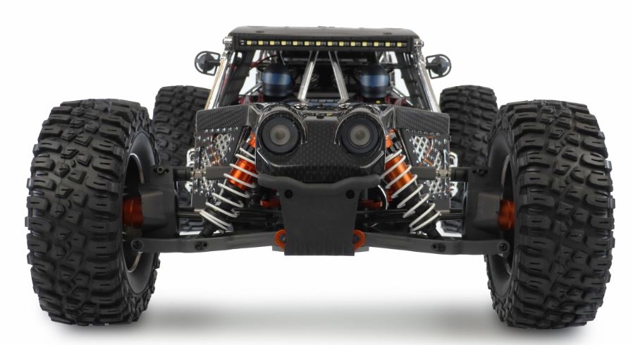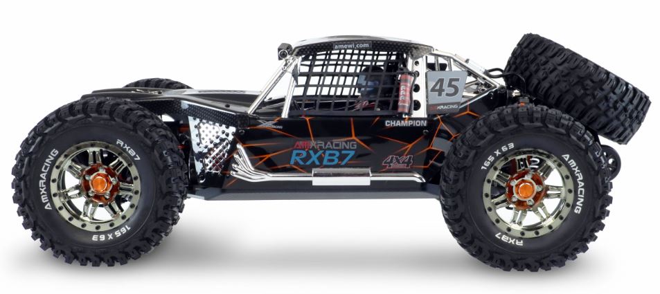 Super Scale Dune Buggy im Maßstab 1:7 mit feinster Ausstattung und einer Endgeschwindigkeit von bis zu 130km/h (optional mit 8S LiPo). Der RXB7 vereint sehr hochwertige Komponenten mit einem extremen Antriebskonzept und einer Top Ausstattung wie z.B. 2x 3S LiPo Akkus im Lieferumfang, einer hochwertigen und präzisen 2,4GHz Fernsteuerung, einem LiPo Ladegerät und vielen gefrästen Aluminiumteilen. Eine über den Sender steuerbare Handbremse, welche es erlaubt das Fahrzeug auf staubigen Pisten perfekt in Kurven zu driften, ist nur ein Highlight dieses brachialen Buggys. Die unbändige Kraft des 4282 Brushless Motors mit einer spezifischen Drehzahl von 2000KV wird über einen 150A Regler feinfühlig angesteuert und wird per Stahl-Kardanwellen and die Differentiale und von dort über Stahl CVD-Antriebswellen an die 4 Räder (4WD) verteilt. Das starke Lenkservo mit Metallgetriebe und einer Stellkraft von 25kg sorgt dabei immer für maximale Performance und ein sehr direktes Ansprechverhalten der Lenkung auf jedem Untergrund. Die beiden Stoßdämpferbrücken, die Querlenkerhalter, Lenkhebel und C-Hubs sowie die Chassis Verstrebung sind aus hochwertigem Aluminium CNC-gefräst. Die Chassisplatte besteht aus massivem 4mm dickem Aluminium und sorgt für perfekte Steifigkeit des Chassis‘.