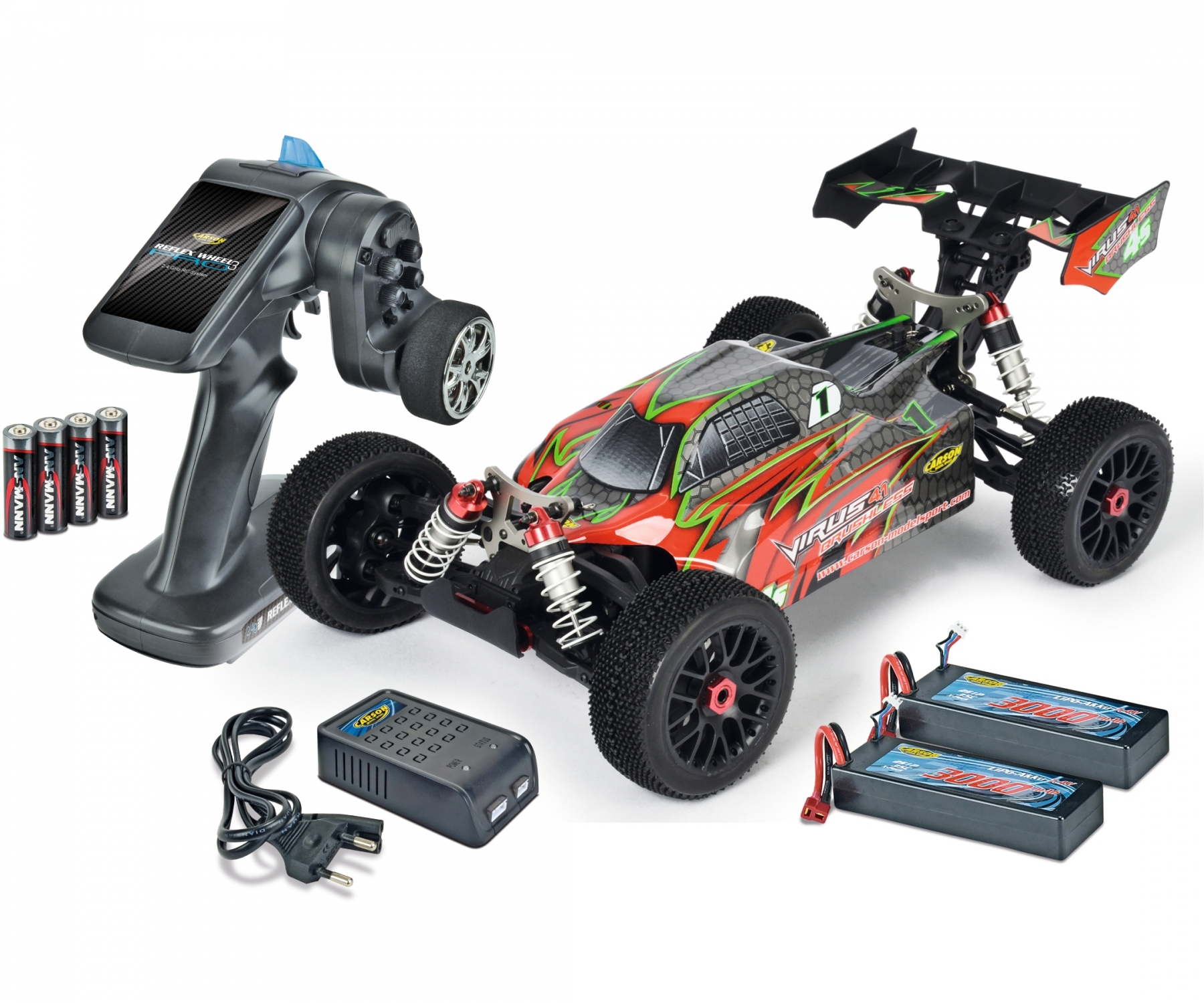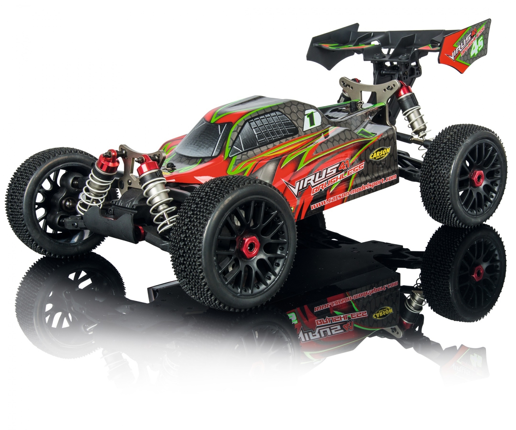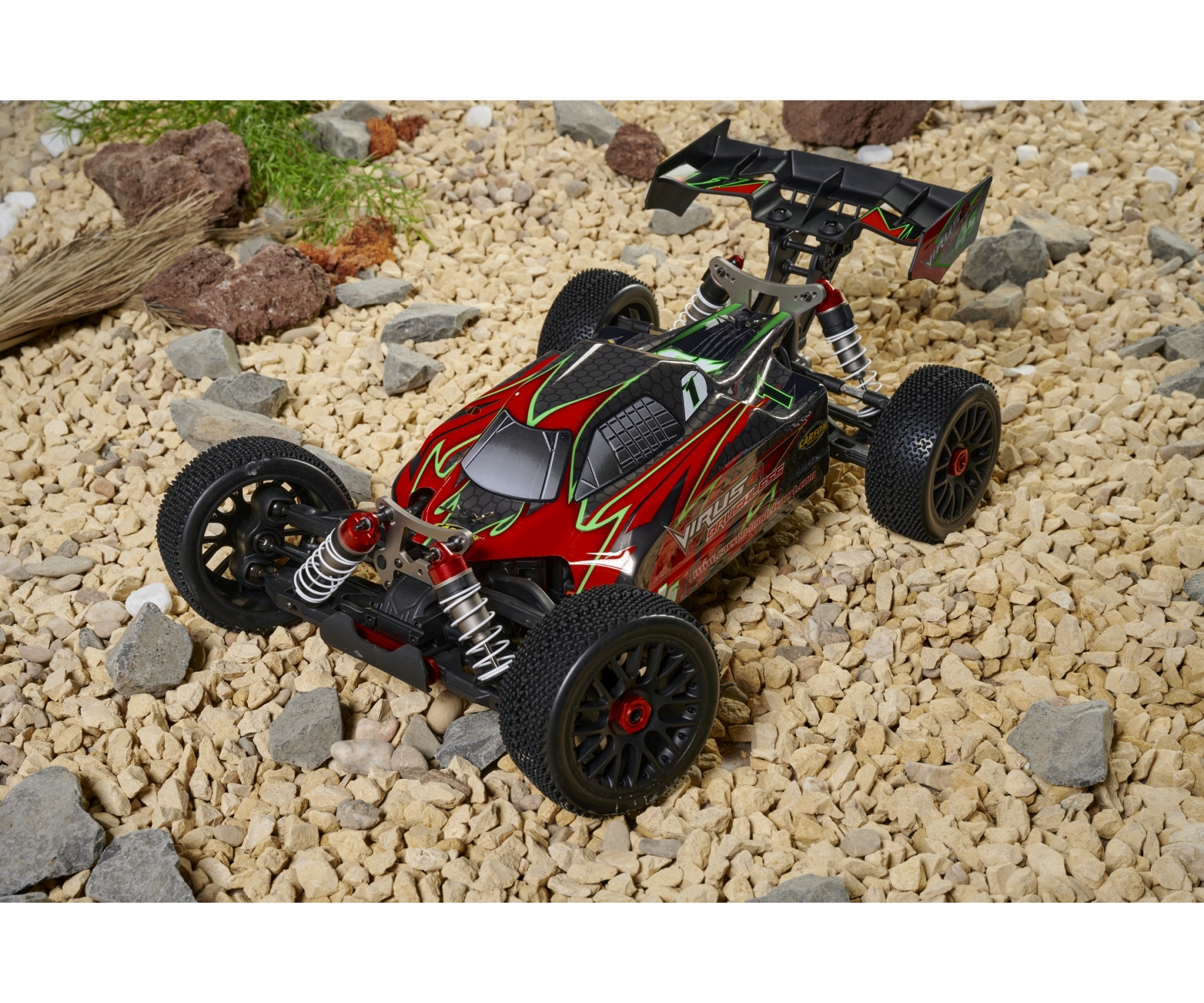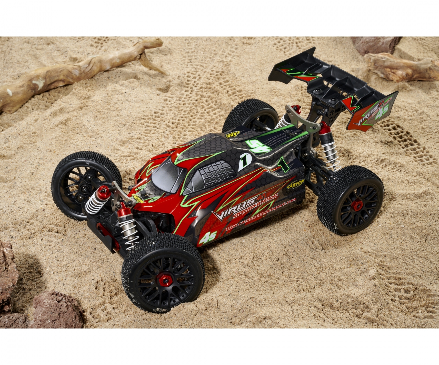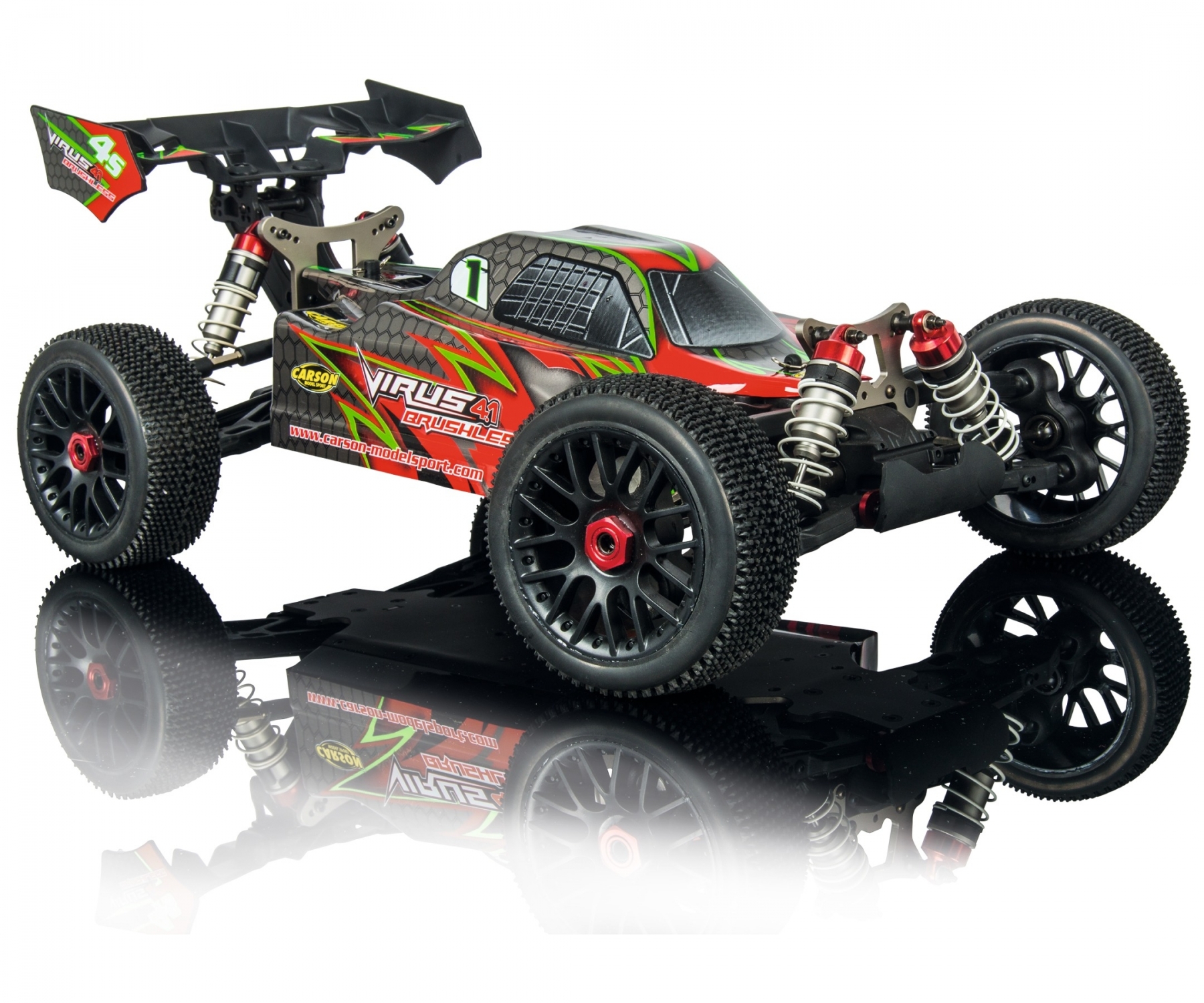 Der CARSON Virus 4.1 Brushless ist der innovative 4WD Buggy mit einem für Off Road-Pisten optimierten Race-Chassis und kraftvollem Brushless-Antrieb. Um das Lenkservo vor Feuchtigkeit zu schützen, wurde das Gehäuse abgedichtet. Das robuste 3 mm Alu-Chassis ist extra schmal und hat je eine Chassisstrebe vorne und hinten. Massive Querlenker und umlaufende Schmutzabweiser sorgen für langanhaltenden Fahrspaß. Der 2100 kV HOBBYWING Brushless-Motor liefert dem Allradantrieb massig Power und beschleunigt den 4.1 auf über 80 km/h. Big Bore Alu-Öldruckdämpfer, der tiefe Schwerpunkt und zahlreiche Setup-Optionen sorgen für perfekte Bodenhaftung und lassen den CARSON Virus 4.1 Brushless über alle Strecken fliegen.