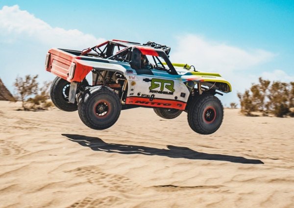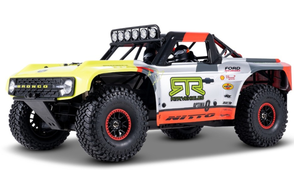 Große Kotflügelverbreiterungen, ein robuster Überrollkäfig, detailliertes Interieur, LED-Beleuchtung und maßstabsgerechte Außenspiegel machen diesen Bronco zu einem der realistischsten Modelle seiner Klasse. Dank der massiven Nitto Trail Grappler Reifen auf Beadlock-Felgen steht auch das Fahrverhalten seinem Vorbild in nichts nach.