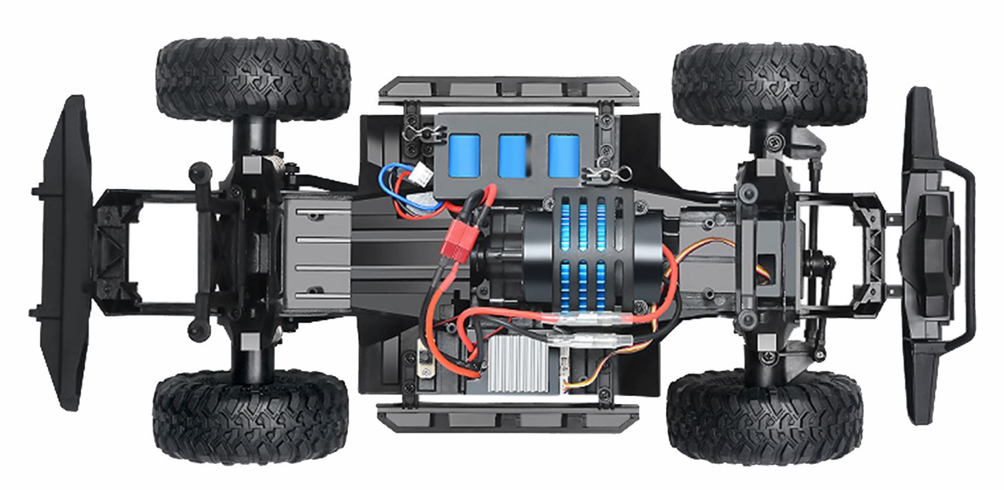 Coole Race Optik trifft auf modernste Features. Dank kräftigem Motor, dem 4WD Allradantrieb und den Oversized-Reifen findet dieser Climbing SUV im Maßstab 1:10 immer seinen Weg aus der Wildnis. Bei Dämmerung hilft zusätzlich die helle LED-Beleuchtung, um jederzeit die Orientierung im Gelände zu wahren. Während die schwarz getönten Scheiben perfekt zum wilden Aussehen passen. lassen sich auf der Ladefläche dieses Crawlers zudem kleinere Dinge transportieren – ein großes Vergnügen für jeden RC-Piloten. Der Kunststoffrahmen des Fahrzeugs wurde so konzipiert, dass er wirkungsvoll Kollisionen abfedert. Kugellager aus Metall, eine vor Spritzwasser geschützte Elektronik und Stoßdämpfer mit echten Metallfedern unterstreichen den wertigen Eindruck des Modells. Durch eine gut in der Hand liegende, feinfühlige Pistolenfernsteuerung mit moderner 2,4GHz Funktechnologie ist gleichzeitig für eine störungssichere Fahrt gesorgt und auch der parallele Einsatz mehrerer Fahrzeuge aus dieser Serie ist kein Problem. Der Pick-Up Racer wird RTR (Ready-to-Run) ausgeliefert, d.h. alle für den Betrieb benötigten Komponenten, selbst die Batterien für die Fernsteuerung, sind bereits im Lieferumfang enthalten.