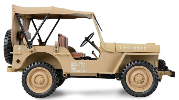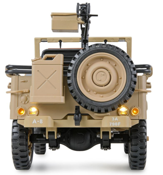 Für ein realistisches Erscheinungsbild verfügt der Jeep Willys MB über zahlreiche Scale-Details wie eine klappbare Frontscheibe, eine abnehmbare Dachkonstruktion, eine klappbare Motorhaube mit Zugang zur Elektronik sowie einen umklappbaren Rücksitz, der das Akkufach verdeckt. Eine funktionierende Seilwinde und eine Anhängerkupplung erweitern die Einsatzmöglichkeiten. Die Scale-LED-Beleuchtung mit beleuchteten Scheinwerfern und Rücklichtern sowie das über DIP-Schalter regelbare Sound- und Beleuchtungssystem tragen zusätzlich zum authentischen Gesamteindruck bei.