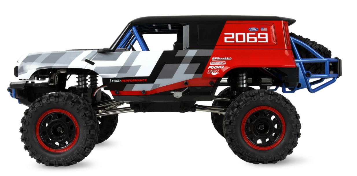 Das RTR-Set (Ready-to-Run) wird inklusive Fernsteuerung, Akku und Ladekabel geliefert und ist sofort einsatzbereit. Die Karosserie im lizenzierten Ford Bronco R Baja 1000 Design besteht aus strapazierfähigem ABS-Kunststoff und ist mit einem robusten Kunststoffkäfig sowie einem praktischen Magnetverschluss ausgestattet. Eine wasserdichte Empfängerbox schützt die Elektronik zuverlässig vor Feuchtigkeit. Für optimale Dämpfung sorgen Öldruck-Stoßdämpfer.