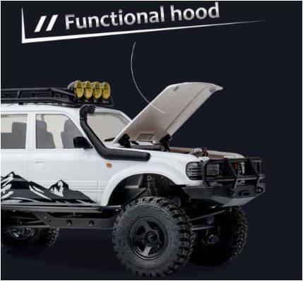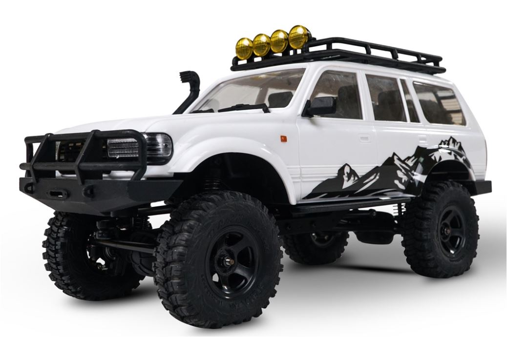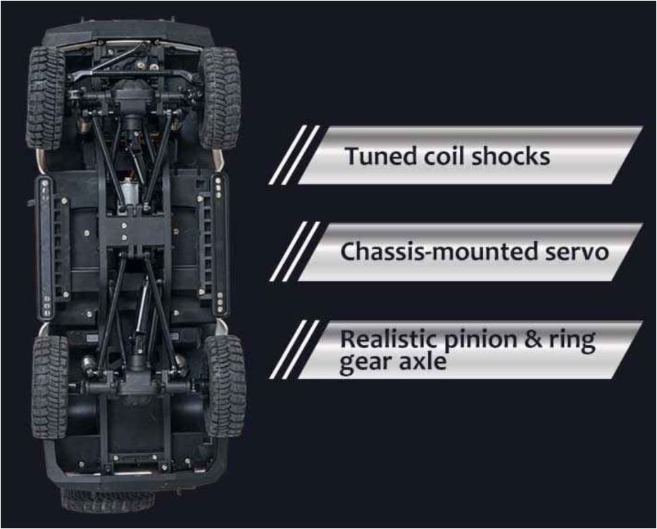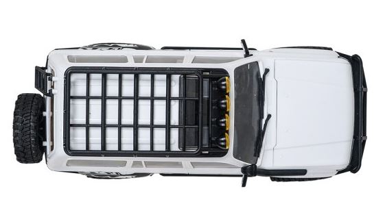 Merkmale • Scaler im Maßstab 1:18 • Spritzgegossene Karosserie • Funktionsfähige Motorhaube • Maßstabsgetreue Innenausstattung • Realistische Ritzel- und Tellerradachse • Rhino-Stoßstangen & Dachgepäckträger • Traktionsstarke 1” M/T-Reifen • AI-funktionale Beleuchtung • Hohe Drehmomentübertragung mit 84:1 FDL • Am Chassis montiertes Servo • Abgestimmte Stoßdämpfer • Inklusive 2 Stück 7,4v 380mAh 2S Lipo-Akku für bis zu 30 Minuten Fahrzeit • Inklusive 2,4GHz Fernsteuerung und Empfänger