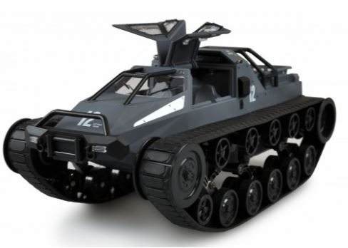 Extrem geländefähiges und futuristisches Kettenfahrzeug mit reichlich Leistung. Das Kettenfahrwerk ist gefedert und die Ketten sind aus Gummi. Somit hat das Modell auf jedem Untergrund genügend Grip. Selbst Wheelis sind problemlos möglich und der Spaß "outdoor" ist fast grenzenlos. Die erreichbare Geschwindigkeit ist ausreichend um wirklich Spaß zu haben und das Gas ist vollproportional steuerbar. Zusätzlich hat das Modell eine LED Lichtleiste auf dem Dach, was auch Fahrten in der Dämmerung zu einem Erlebnis der besonderen Art macht. Aufgrund des Spritzwasserschutzes ist das Modell uneingeschränkt geländefähig und der mitgelieferte 1200mAh Li-Ion Akku sorgt für ausreichende Fahrzeit. Das ebenfalls enthaltene Balancer Ladekabel (USB) rundet das Paket in Verbindung mit dem störungsfreien 2,4GHz Steuersystem ab. Zudem sind die Flügeltüren am Modell bedienbar (öffnen / schließen) was den Scale Charakter des Modells erhöht. Weiter verfügt das Modell über eine Antriebsbox mit Doppel Planetengetriebe, eine Führungsrad-Halterung aus Metall und eine selbsteinstellende Spurweitenregulierung der Vorderräder (dieses verhindert ein Abspringen der Ketten), das Fahrwerk ist komplett gefedert.