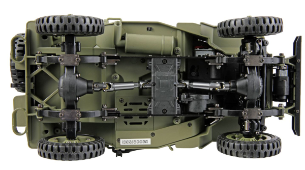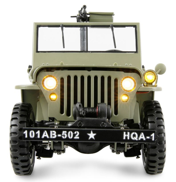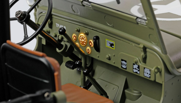 Für ein realistisches Erscheinungsbild verfügt der Jeep Willys MB über zahlreiche Scale-Details wie eine klappbare Frontscheibe, eine abnehmbare Dachkonstruktion, eine klappbare Motorhaube mit Zugang zur Elektronik sowie einen umklappbaren Rücksitz, der das Akkufach verdeckt. Eine funktionierende Seilwinde und eine Anhängerkupplung erweitern die Einsatzmöglichkeiten. Die Scale-LED-Beleuchtung mit beleuchteten Scheinwerfern und Rücklichtern sowie das über DIP-Schalter regelbare Sound- und Beleuchtungssystem tragen zusätzlich zum authentischen Gesamteindruck bei.