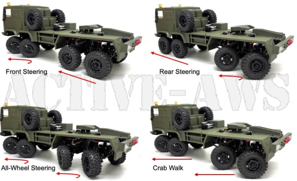 Das revolutionäre aktive Allradlenksystem (Active-AWS) des Terranaut 8X8 ermöglicht die unabhängige Steuerung der Vorder- und Hinterräder über einen 6-Kanal-FlySky-Sender. Mit dem Standardlenkrad und einem daumenbetätigten Schwenkhebel können enge U-Turns, Crab Walk Manöver sowie das unabhängige Ansteuern der Vorder- und/oder Hinterradlenkung nach Belieben und dabei vollständig proportional ausgeführt werden.