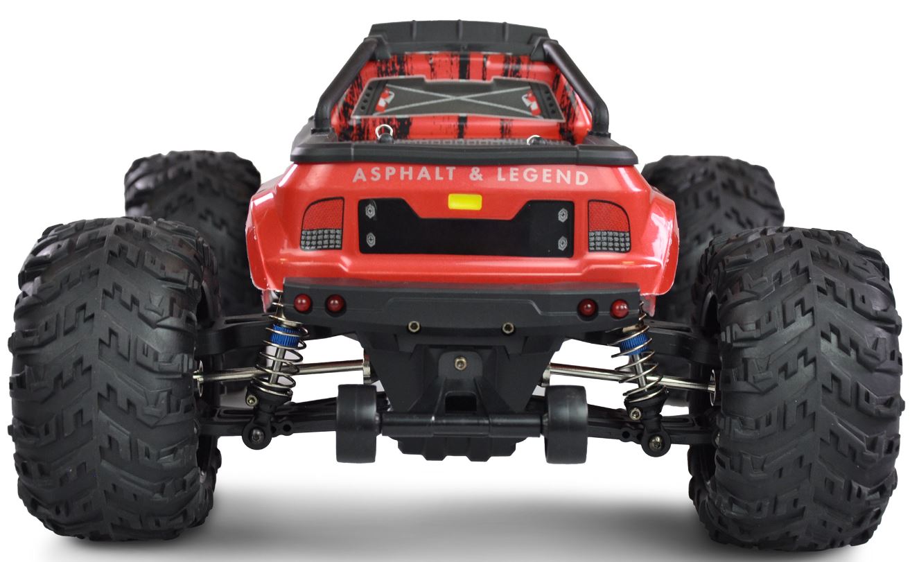 Auch die weiteren Features wissen zu überzeugen: Die Öldruckstoßdämpfer, übergroßen Reifen, das Fahrwerk, die Metall-CVD-Antriebswellen vorne, Metallantriebswellen hinten, Metall Kardanwellen, Metallbodenplatte und die Metallgetriebe im Fahrzeug sorgen für eine lange Haltbarkeit. Eine komplett schaltbare und helle LED-Beleuchtungsanlage (vorne, hinten, Dach) runden das gesamte Paket ab. Als optischer Aspekt wurde das Modell rundherum mit Bremsscheiben-Attrappen ausgerüstet. Ein zusätzlicher Pluspunkt ist das Sende- / Empfangssystem in 2,4GHz, das bereits komplett eingestellt ist. Über einen frei belegbaren, vierten Kanal verfügend können Zubehörteile verwendet werden. Zur Sicherheitsausstattung des Modells gehört unter anderem eine Akku-Überwachung, welche sich bei Unterspannung lautstark bemerkbar macht und das Fahrzeug bei Nichtbeachten in den Ruhemodus versetzt. Die gesamte Elektronik und auch das Servo ist vor Spritzwasser geschützt. Einem Einsatz im harten Outdoor-Gelände sind somit kaum Grenzen gesetzt.