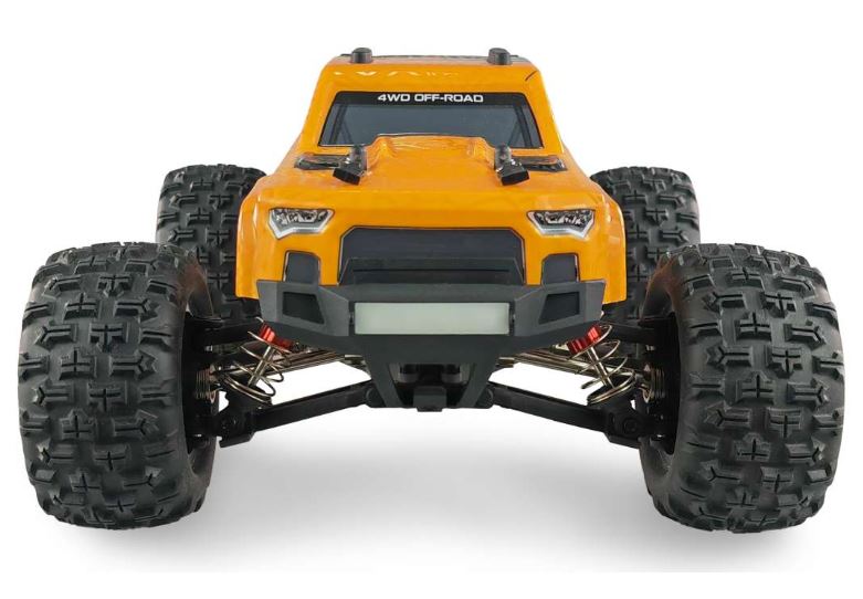 Das Chassis sowie Querlenker und Dämpferbrücken sind aus Composite-Kunststoff gefertigt. Ein einstellbares Fahrwerk und die Aluminium-Öldruckdämpfer sorgen für ein direktes Fahrverhalten – voller Kontrolle bei voller Fahrt verleiht. Der Monstertruck ist spritzwassergeschützt und kugelgelagert. Damit ist das Modell uneingeschränkt outdoortauglich, macht auf jedem Untergrund eine gute Figur. Für eine effiziente Kraftübertragung des starken Antriebes an alle vier Räder (4WD) wurde das Fahrzeug zusätzlich mit einem Hauptzahnrad und einem Motorritzel aus Metall ausgestattet. Eine gut in der Hand liegende 2,4GHz Fernsteuerung liegt dem RTR-Set ebenfalls bei.
