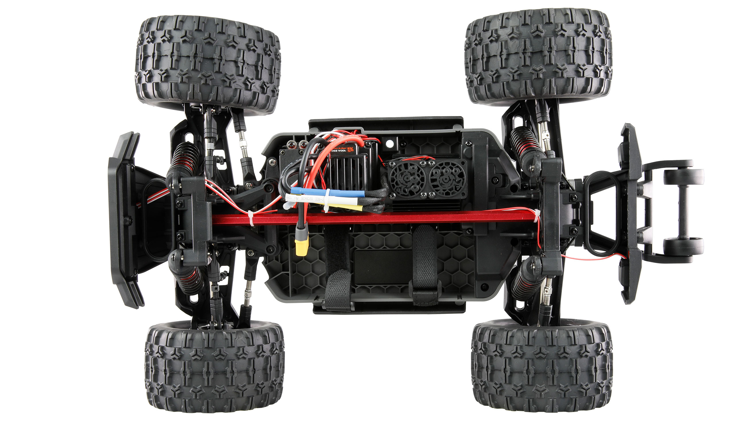 Die Chassis-Verstrebungen unter der Karosserie sind wie bei den 1:14er-Modellen aus Aluminium gefertigt, was für hohe Verwindungssteifigkeit sorgt. Lenkbefehle werden durch das leistungsstarke 35kg Standard-Servo mit Metallgetriebe präzise und direkt umgesetzt. Der 2500kv Brushless-Motor, zusammen mit 100A Regler, bietet auf jedem Untergrund mehr als genug Kraft. Das Modell ist für 3S als auch 4S LiPo-Akkus ausgelegt, was sowohl Einsteigern als auch Profis gerecht wird.
