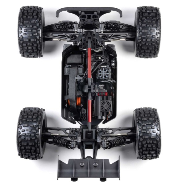 Jetzt hat ARRMA seine Haltbarkeit und seinen Punch mit wichtigen Upgrades gesteigert, damit du deine Tricks auf die Spitze treiben kannst. Chassisplatte, Differentiale, Frontstoßstange, Unterfahrschutz und sogar die Flügelhalterung wurden alle mit EXB-Teilen (Extreme Bash) verstärkt. Neue Side Guards, eine zweiteilige Tower-to-Tower-Brace und ein innerer Karosserieturm tragen zu mehr Festigkeit, einfacherer Wartung und einem saubereren Aussehen bei. Die berühmte NOTORIOUS-Karosserie im Retro-Look hat jetzt eine auffällige Lackierung, die von Kampfflugzeugen aus dem Zweiten Weltkrieg inspiriert ist, sowie ein praktisches, schnell lösbares, Clipless Karosseriehaltesystem.