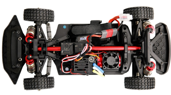 Zur optimalen Kontrolle und Feinabstimmung sind einstellbare ölgedämpfte Metall-Stoßdämpfer, ein justierbares Fahrwerk und ein Fahrstabilitätssystem (Gyro) integriert. Der eingebaute 45A ESC sorgt für eine feinfühlige Beschleunigung, während die LED-Beleuchtung mit verschiedenen Modi auch Drifts und On-Road-Rennen in der Dämmerung ermöglicht. Für präzise Kurvenkontrolle und stabiles Geradeausfahren sorgen sowohl der Gyro als auch das digitale 17g-Lenkservo. Dank der hochwertigen 2,4GHz-Fernsteuerung ist der Betrieb mehrerer Fahrzeuge gleichzeitig möglich.