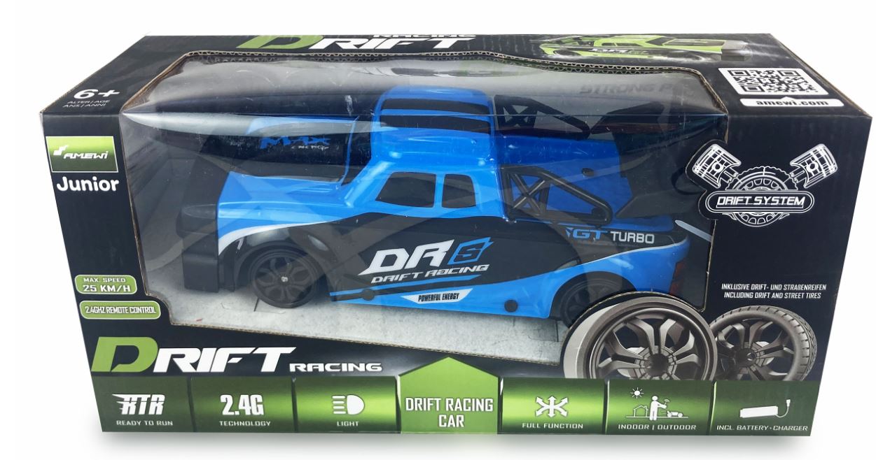 Willkommen in der aufregenden Welt des Driftens – die Action startet mit dem Racing Car DRs im Maßstab 1:18 sofort aus der Box. Eine präzise 2,4GHz Pistolenfernsteuerung vermittelt ein direktes Fahrgefühl, während das schnelle Lenkservo für präzises Handling sorgt. Der kraftvolle 4WD-Antrieb in Verbindung mit dem großen Akku ermöglicht lange Fahrzeiten und beeindruckende Top-Speeds von bis zu 25 km/h.