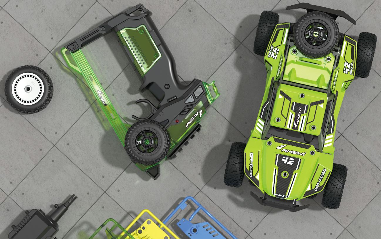 Bausatz eines coolen 2WD-Racers im Maßstab 1:18, der Aufbau- und Fahrspaß miteinander kombiniert. Das 72-teilige Modell ist dank intelligentem Stecksystem komplett ohne Werkzeug innerhalb von 30min montierbar und hält ganz ohne Klebstoff. Der gesamte Aufbau und die Karosserie bestehen aus festem ABS-Kunststoff. UV-beständige Aufkleber mit trendigen Mustern verleihen dem Frog bei Bedarf eine individuellere Optik. Mit Reifen aus einer High-Grip Gummimischung, Stoßdämpfen und Spritzwasserschutz ist das Modell ebenso outdoortauglich und macht auch im Gelände eine gute Figur. Der Buggy erreicht eine Höchstgeschwindigkeit von ca. 8m/h. Eine moderne 2,4GHz Pistolenfernsteuerung ist bereits im Lieferumfang enthalten. Für die Inbetriebnahme des Modells werden lediglich noch haushaltsübliche Batterien für das Fahrzeug und die Fernsteuerung benötigt.