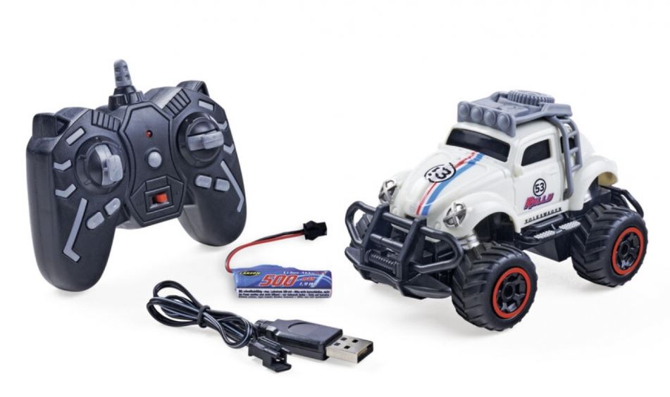 Ein Kult auf Rädern – aber anders: Der VW Beetle Rally in Weiß besticht durch seine großen Profilreifen und seinem bulligen Auftreten. Das klassische Design ist den Originalen durch die Volkswagenlizenz nachempfunden. Die rote LED-Unterbodenbeleuchtung sorgt zusätzlich für einen Hingucker. Durch die mitgelieferten Komponenten wie den 3.7 V 500 mAh Lilon Akku und Ladegerät ist das Fahrzeug schnell einsatzbereit und lässt sich bei voller Fahrlast bei 50 m Reichweite über eine Dauer von starken 60 Minuten durch das Gelände steuern.