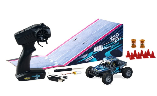 Der 1:32 Deemon X ist der ideale Mini-RC-Begleiter für Haus und Garten. Der einfach zu steuernde kleine 2WD RC-Buggy verfügt über zwei Geschwindigkeitsstufen und ist extrem wendig. Dank der über den Sender ein- und ausschaltbaren LED-Beleuchtung des Fahrzeugs ist der Deemon X auch im Dunkeln immer einsatzbereit. Die griffigen Gummireifen sorgen auch auf unebenen Untergründen für immer genug Grip. Zum Lieferumfang gehören neben der optisch aufgewerteten, und zum Fahrzeug passenden Sprungschanze eine 2,4 GHz 3-Kanalfernsteuerung, ein LiPo-Fahrakku, Werkzeug und mehrere Pylonen zum Aufbau einer Rennstrecke. Nach einer langen Fahrzeit von 15 min kannst du den kleinen Flitzer ganz bequem per USB-Kabel wieder aufladen. Kaufen – Laden – Fahren!