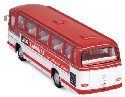 Der O 302 von Mercedes-Benz wurde 1965 vorgestellt, bis 1976 wurden mehr als 32.000 Exemplare gebaut. Eingesetzt wurde der Hochflurbus als echter Allrounder im Stadt-, Überland- und auch im Fernreiseverkehr. Das CARSON-Modell im Maßstab 1:87 verfügt über eine störungsfreie 2.4 GHz Fernsteueranlage, die eine fein abgestimmte Steuerung (digital-proportional) von Gas und Lenkung mit Lenkungstrimmung ermöglicht. Der eingebaute Li-Ion Fahrakku sorgt für eine extra lange Fahrzeit von bis zu 60 Minuten bei nur 30 Minuten Ladezeit. Geladen wird der Mini-Bus über den Power-Plug direkt am Sender. Damit ist der schicke Omnibus stets fahrbereit: auf der Eisenbahnanlage, auf dem Schreibtisch oder auch unterwegs. Die detaillierte Lackierung und die AEG-Lavamat-Bedruckung sowie die funktionierenden Front- und Rückleuchten verleihen dem kleinen Klassiker den letzten Schliff. Das typische Motorengeräusch ist unverkennbar und lässt sich über den Sender ein- und ausschalten. Aufbewahrt werden Fahrzeug und Sender in einer mitgelieferten Vitrine. 4 AAA-Senderbatterien vervollständigen den Lieferumfang zu einem 100 % Komplett-Set. Viel Spaß mit dem Mercedes-Benz O 302 AEG! Kaufen – Laden – Fahren!