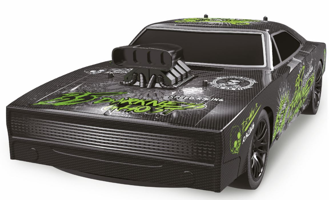 Hammer Optik trifft auf ausgereifte Technik – anders ist dieser Nachbau eines legendären Amerikanischen Muscle Cars nicht zu beschreiben. Der ferngesteuerte Glattbahner im Maßstab 1:10 wird als 2WD RTR-Version fahrfertig ausgeliefert, d.h. im Lieferumfang ist wirklich alles enthalten, was für den Betrieb des Modells notwendig ist. Durch das auffällige Neongrün in Kombination mit der in Carbon-Optik gestalteten Karosserie und den stylischen Aufdrucken wird das RC Ghost Car zum echten Hingucker. Ein monströser Kompressor mittig auf der Motorhaube und die schwarzen Felgen mit High-Grip Gummireifen unterstreichen die kraftvolle Racing-Optik zusätzlich. Dank des starken Brushed-Elektromotors und einem störungssicherem 2,4GHz System ist eine beachtliche Höchstgeschwindigkeit von 20 km/h gut zu kontrollieren. Die handliche Pistolenfernsteuerung ermöglicht dabei die volle Fahrkontrolle in alle Richtungen (vor/zurück/rechts/links). Mit dem mitgelieferten Ni-MH Akku 7,2V 500mAh sind Fahrzeiten von etwa 10 Minuten am Stück möglich. Wenn die Energie mal ausgehen sollte, lässt sich der Akku per USB-Kabel innerhalb kurzer Zeit wieder aufladen.