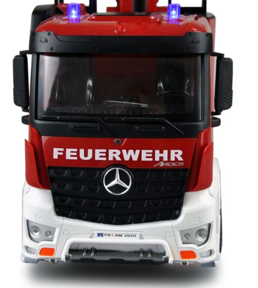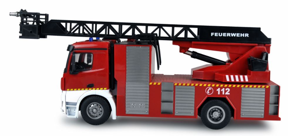 Exklusives Lizenzmodell eines Mercedes AROCS Leiterfahrzeugs der deutschen Feuerwehr. Maßstab 1:18. Dieser wunderschöne Nachbau besticht durch seine Detailtreue, die voll proportionalen Fahrfunktionen, dem klassischen Martinshorn-Sound und durch die helle LED-Beleuchtung. Weitere Funktionen wie drehbare Leiter mit Höhenverstellung, Spritzwasserfunktion (Reichweite ca. 2m) oder Licht, Sound und Trimmung der Lenkung sind leicht über den mitgelieferten 2,4GHz Sender in edlem Schwarz/Rot mit Aluknüppeln zu bedienen. Die Reichweite des Senders / Modells beträgt ca. 30-50m. Die Beschriftung ist vollständig auf Deutsch und das Modell trägt das originale Mercedes Benz Logo (weltweite Exklusiv-Lizenz für Amewi). Alle Anbauteile und Applikationen entsprechen dem Original-Fahrzeug. Die Auslieferung erfolgt in einem hochwertigen schwarzen Karton mit Mercedes Aufdruck und Hologramm mit Seriennummer der Daimler AG. Der kräftige 2WD Hinterrad-Antrieb mit den Gummireifen sorgt für ausreichend Traktion, um auch an schwierigere Stellen zu gelangen. Der mitgelieferte 1200mAh Li-Ion Akku sorgt dabei je nach Untergrund und Feature-Nutzung für eine Fahrzeit von ca. 10-15 Minuten. Der Akku ist wechselbar und mit optionalen Ersatz-Akkus ist ein langer Spielspaß garantiert. Zum Laden des Akkus liegt dem Set ein USB-Kabel bei.