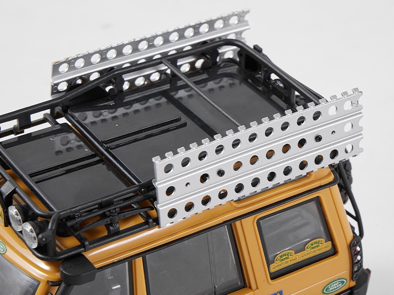 Das Modell Der FMS FCX24 Land Rover Camel Trophy, offiziell lizenziert von Land Rover verfügt über eine klappbare Hartschalen-Karosserie. Sowohl die vorderen und hinteren Stoßstangen, Kotflügelverbreitungen, Außenspiegel und Türgriffe sind abnehmbar, was z.B. Scale Enthusiasten individuelle Lackierungen vereinfacht. Aus der Camel Trophy sind 4 verschiedenen Fahrzeugtypen erhältlich: • Defender 90 • Defender 110 • Discovery • Range Rover Jedes der vier Modelle verfügt über einen Dachgepäckträger und funktionsfähige Front- und Heckscheinwerfer, die über die Fernsteuerung geschaltet werden können. Die auf dem Dach montierten Suchscheinwerfer haben festgelegte Lampenpositionen was die Installation von zusätzlichen LED vereinfacht.