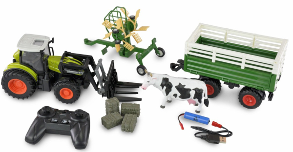 Landwirtschaft in allen Facetten: Mit einem XL-Zubehörpaket lässt sich nun das Leben auf dem Bauernhof ferngesteuert drinnen wie draußen in all seinen Facetten nachspielen. Bereits ab 6 Jahren geeignet, sorgt der RC-Traktor im Maßstab 1:24 mit Frontlader, Gabel sowie einem Kreiselschwader (Heuwender), einem Anhänger, Strohballen und einer Milchkuh für riesige Einsatz-Vielfalt.
