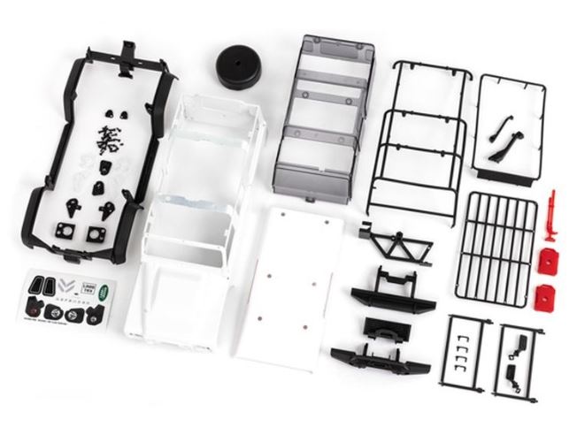 Karosserie, Defender, komplett (nicht zusammengebaut) (weiß, muss lackiert werden) (einschließlich Kühlergrill, Seitenspiegel, Türgriffe, Kotflügelverbreiterungen, Scheibenwischer, Reserveradhalterung und klicklose Montage). Die Karosserien werden zum Lackieren zerlegt geliefert, enthalten jedoch Karosseriezubehör und Montageteile.