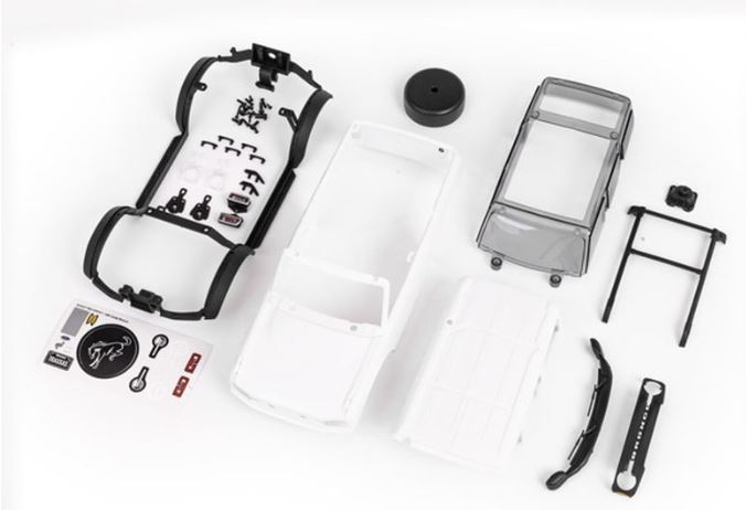 Karosserie, Ford Bronco, komplett (nicht zusammengebaut) (weiß, muss lackiert werden) (einschließlich Kühlergrill, Seitenspiegel, Türgriffe, Kotflügelverbreiterungen, Scheibenwischer, Reserveradhalterung und klicklose Montage). Die Karosserien werden zum Lackieren zerlegt geliefert, enthalten jedoch Karosseriezubehör und Montageteile.