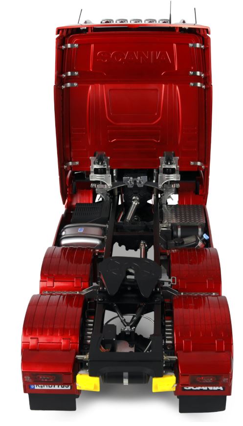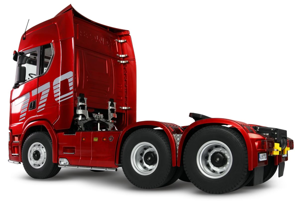 Das RTR-Set wird komplett einsatzbereit geliefert und enthält neben dem Modell auch Fernsteuerung, Akku sowie ein passendes Ladekabel. Der manuelle Universalsattel aus Metall ermöglicht die Verwendung verschiedenster Trailer im Maßstab 1:14. Weitere Details wie die zu öffnenden Türen am Fahrerhaus, durchsichtige Scheiben mit freiem Blick auf das realistisch gestaltete Interieur und die offizielle Lizenzierung des Scania 770 unterstreichen den hohen Qualitätsanspruch dieses Modells.