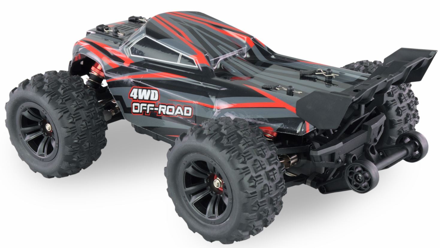 Die gesamte Elektronik ist vor Spritzwasser geschützt und erlaubt den uneingeschränkten Outdooreinsatz. Die groß dimensionierten High-Grip-Reifen aus weichem Gummi sorgen dabei für vollen Halt auf jedem Untergrund. Zusätzlich ist im Modell mit eine helle schaltbare LED-Beleuchtung eingebaut, um auch in der Dunkelheit großartige Action zu haben.