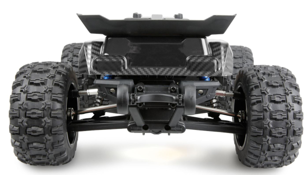 Die robuste Polykarbonat-Karosserie verfügt über einen praktischen Schnellverschluss vorne und nur zwei Splinte hinten, wodurch der Akkuwechsel besonders einfach gelingt. Ein schaltbares, helles LED-Panel im Front-Stoßfänger sorgt für gute Sichtbarkeit bei Dämmerung, während die mitgelieferte Wheelie Bar bei schnellen Beschleunigungen die Kontrolle über das Fahrzeug erleichtert. Alle Kunststoffteile bestehen aus widerstandsfähigem Composite-Material, das Langlebigkeit und Stabilität gewährleistet.