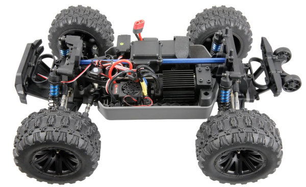 Das RTR-Set wird vollständig fahrfertig geliefert und beinhaltet Fernsteuerung, Akku und Ladekabel. Eine wassergeschützte Empfängerbox ermöglicht den Einsatz bei nahezu allen Wetterbedingungen, während die griffige Gummibereifung und die Metall-CVD-Antriebswellen vorne und hinten für maximale Traktion und Belastbarkeit sorgen. Das Chassis ist in einer leichten, stabilen Wabenstruktur ausgeführt und durch eine massive Metall-Strebe zusätzlich versteift, was die Verwindungssteifigkeit deutlich erhöht.