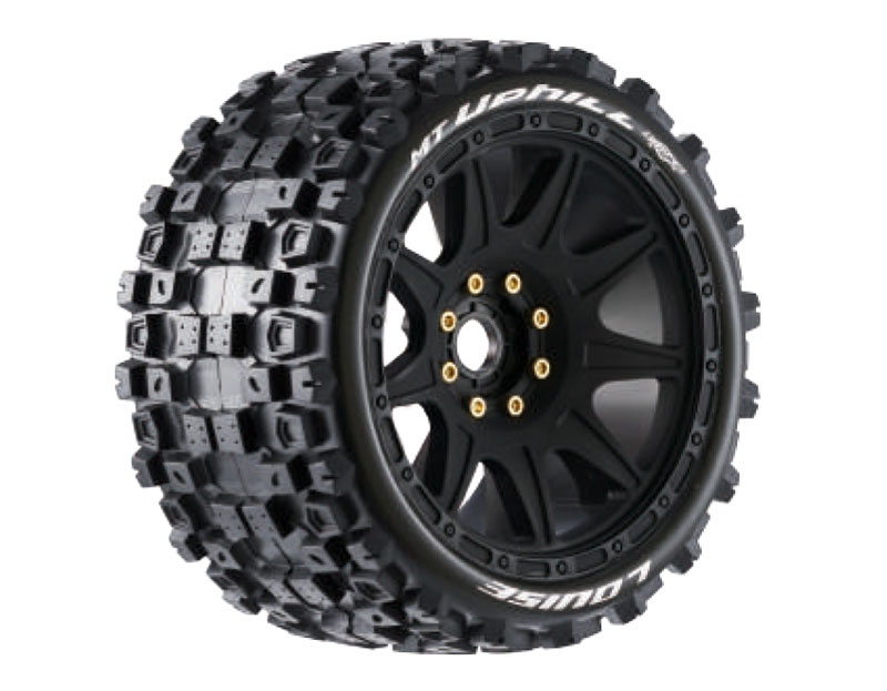 MT-UPHILL MFT SOFT AUF FELGE SCHWARZ 17MM (0&1/2 OFFSET) (2) LOUISE 1/8 MONSTER TRUCK (TAUSCHBARE RADMITNEHMER) Abmessungen: Hex: 17mm Offset austauschbar: 0" & 1/2" Compound: Soft Reifendurchmesser: 148mm Breite: 80,5mm Modelle: 1/8 Monster Truck