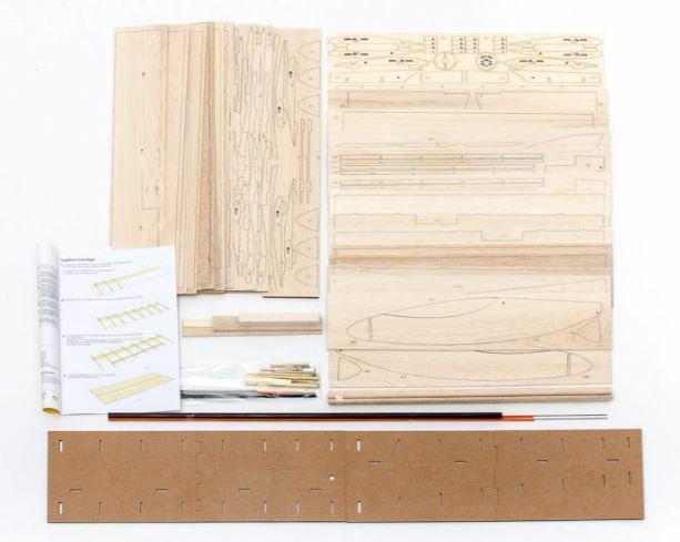 Der Bausatz enthält alle lasergeschnittenen Holzteile, eine Bauhelling für Tragflächen und Rumpf, Carbon-Rumpfstab, Kleinteile für Anlenkungen, Bowdenzüge, großer Dekorbogen als Plot-Aufkleber, 3D-Bauanleitung.