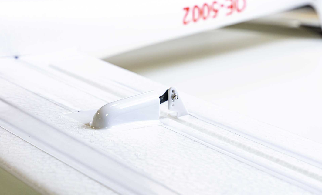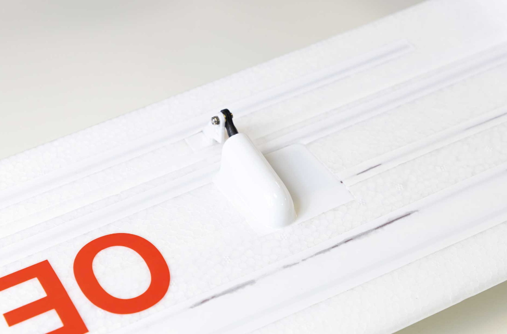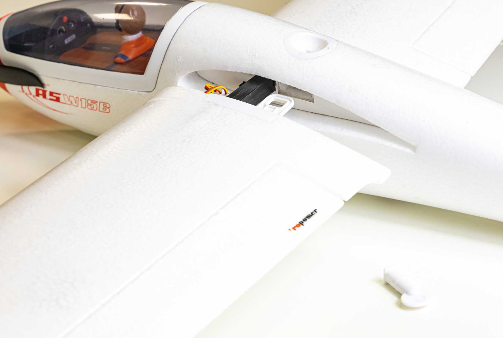 - Servokabelkanal und Verstärkungsprofil in der Tragfläche mit Klebeband (weiß) abgedeckt.