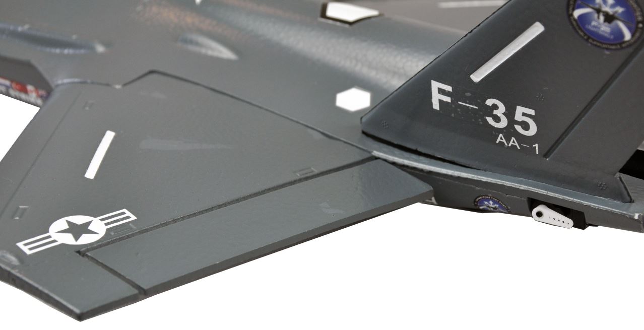 Die AMXFlight F-35 ist ein Scale Nachbau in der PNP-Ausführung (Plug and Play). Das Modell ist weitestgehend vorgefertigt – der Zusammenbau beschränkt sich lediglich auf das Montieren der Tragfläche, der Anlenkungen und des Leitwerks. So sind alle Servos (2x 9g), der 50mm 11-Blatt Impeller inkl. 4900KV Brushless-Motor und der 30A Hobbywing ESC bereits fertig eingebaut.