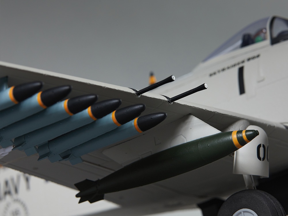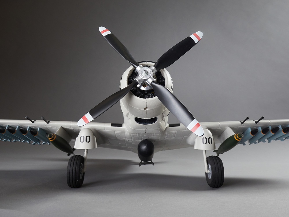 Eigenschaften • stabile und leichte EPO-Hartschaumkosntruktion • mit wenigen Handgriffen flugfertig montiert • leistungsstarker 1200KV Brushless-Motor und 20A Regler eingebaut • 4x 9g Servos fertig eingebaut • zahlreiche Scale Details wie Nieten, Bewaffnung, Motoren-Attrappe, u.v.m. • fertig lackiert und beklebt • bemalte Pilotenfigur eingebaut • stabiles Fahrwerk • abnehmbare Kabinenhaube • inklusive 4-Blatt-Propeller • erhältlich in dunkelblau oder hellgrau