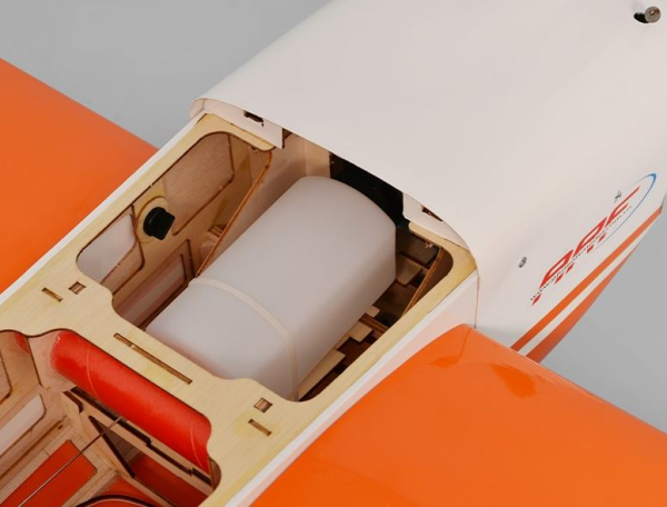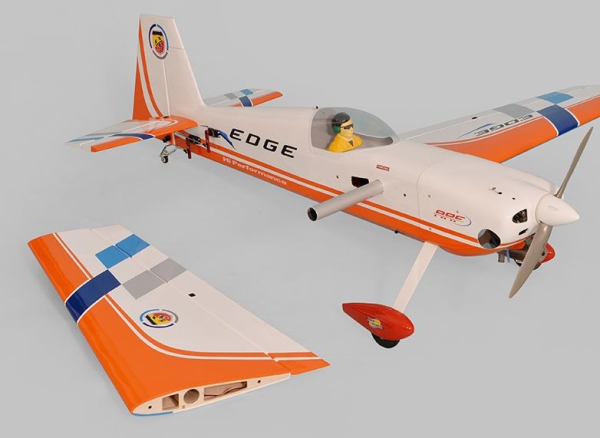 Holzkonstruktion mit enorm hohen Vorfertigungsgrad Das Modell ist in extrem leichter und verstärkter Holzbauweise gefertigt. Dabei besticht die lasergeschnittene Konstruktion durch einen enorm hohen Vorfertigungsgrad, wodurch sich der Bauaufwand nahezu auf den Einbau von Antrieb und Elektronik reduziert. Unter der großen abnehmbaren GFK-Kabinenhaube befindet sich viel Platz für den Einbau der Elektronik. Die Edge ist komplett fertig mit Folie bespannt.