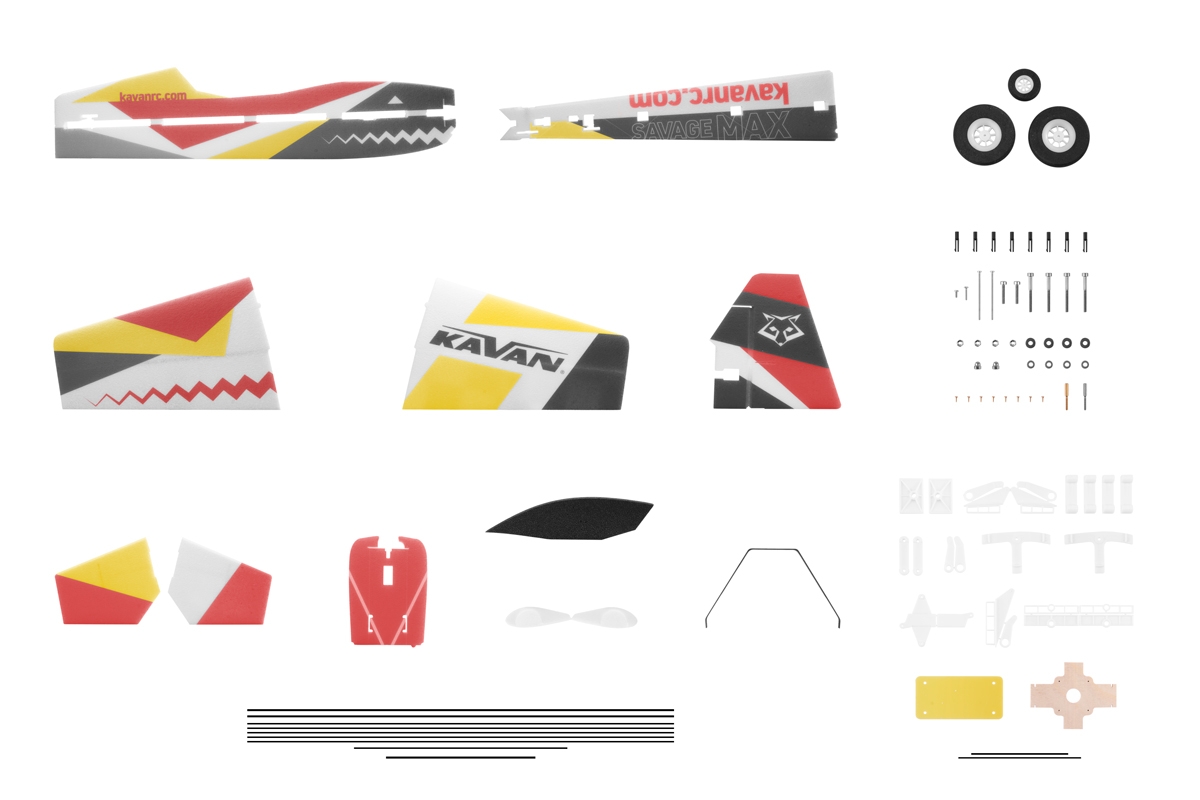 Der Baukasten beinhaltet: bedruckte Rumpf-, Flügel-, Leitwerksteile und Fahrwerkabdeckungen aus EPP-Schaum, eine Sperrholz-Motorbefestigung, 3D gedruckte Kunststoffteile, Kohlefaserverstärkungen, Hebel, Gabeln, Gestänge und weiteres Kleinteile-Zubehör, Kohlefaser-Fahrwerk mit leichten Rädern, eine ausführliche Bauanleitung mit Abbildungen.