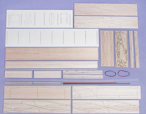 Wie von aero-naut gewohnt sind alle Teile exakt lasergeschnitten. Die Nasenleiste des Modells ist bereits in Form gefräst – hier sind keine Schleifarbeiten nötig. Die Tragfläche wird mit vorgeformten Balsateilen mit Hilfe von Stützrippen zusammengeklebt. Die Ohren der Flächen werden bereits mit der passenden V-Form hergestellt, die dann nicht mehr aufwendig zugeschliffen werden muss.
