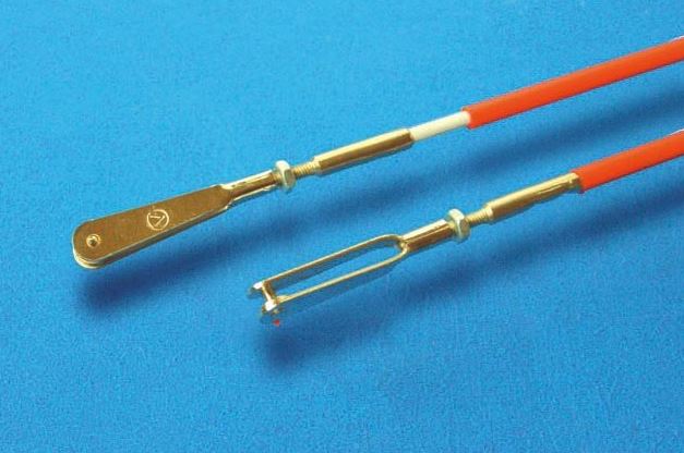 Einseitig fertig montierter Bowdenzug. Innenrohr mit durchgehendem Stahldraht verstärkt. Anschluß mit Löthülse, Kontermutter und Gabelkopf M 2. Durchmesser: Außenrohr 3 mm, Innenrohr 2 mm - Länge 1 m
