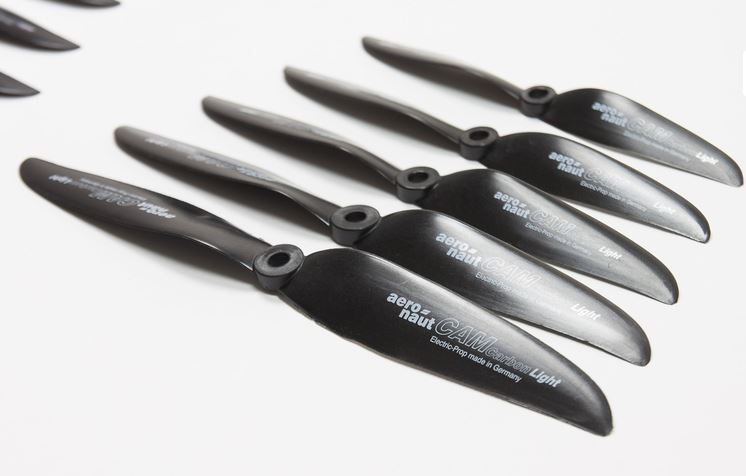 Die Entwicklung wurde auf einem CAD-System durchgeführt, um einen exakten Verlauf der Steigung und Profilform zu gewährleisten. Die Blattform ist baugleich mit unseren bewährten Cam-Carbon-Klappluftschrauben, jedoch mit einer kleineren und damit leichteren Nabe. Die in CNC-Technik gefertigten Formen sowie die kohlefaserverstärkten Luftschrauben werden ausschließlich in Deutschland hergestellt. Im Lieferumfang ist ein Distanzringsatz für die Wellendurchmesser 5, 6, 6,3 und 7 mm enthalten.