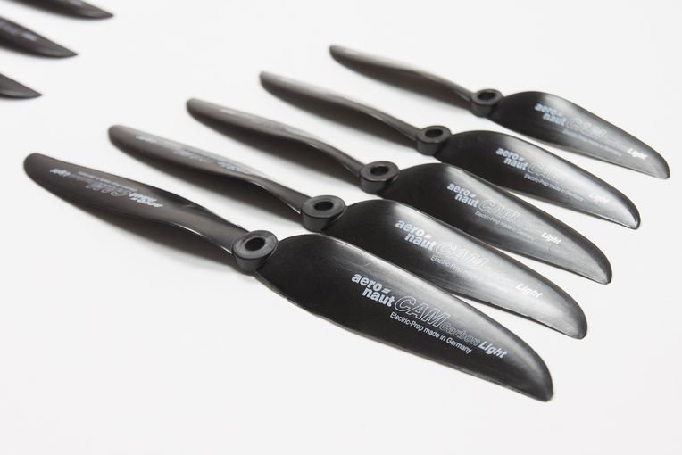 Die Entwicklung wurde auf einem CAD-System durchgeführt, um einen exakten Verlauf der Steigung und Profilform zu gewährleisten. Die Blattform ist baugleich mit unseren bewährten Cam-Carbon-Klappluftschrauben, jedoch mit einer kleineren und damit leichteren Nabe. Die in CNC-Technik gefertigten Formen sowie die kohlefaserverstärkten Luftschrauben werden ausschließlich in Deutschland hergestellt. Im Lieferumfang ist ein Distanzringsatz für die Wellendurchmesser 5, 6, 6,3 und 7 mm enthalten.