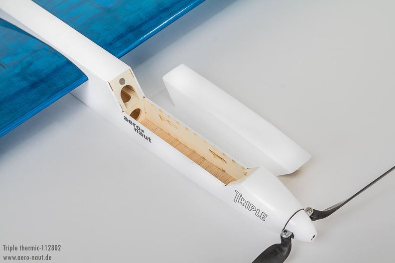 Der Seglerrumpf bietet in seiner schlanken Bauweise beste aerodynamische Eigenschaften. Der Elektrorumpf ist nur im vorderen Bereich ein wenig breiter, kann 28-mm-Außenläufermotoren bequem aufnehmen und bietet Platz für einen 3s-LiPo bis ca. 2.500 mAh.
