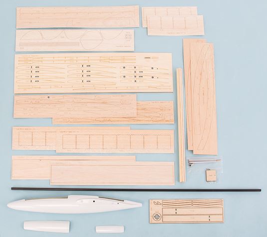 Der Modellbausatz enthält sämtliche lasergeschnittenen Holzteile zum Aufbau der Tragflächen und Leitwerke, weißen GfK-Rumpf und weiße Kabinenhaube, die bekannte aero-naut Helling, Kiefernholme, Ruderanlenkungen und Bowdenzüge, diverse Kleinteile. Eine ausführlich bebilderte Bauanleitung im bewährten aero-naut 3D-Stil führt zum schnellen Bauerfolg. Ein passender Spinner und Mittelstück für Klappluftschraubenliegen dem Bausatz ebenfalls bei. Der Spannkonus abhängig von der Motorwelle wird zusätzlich benötigt.