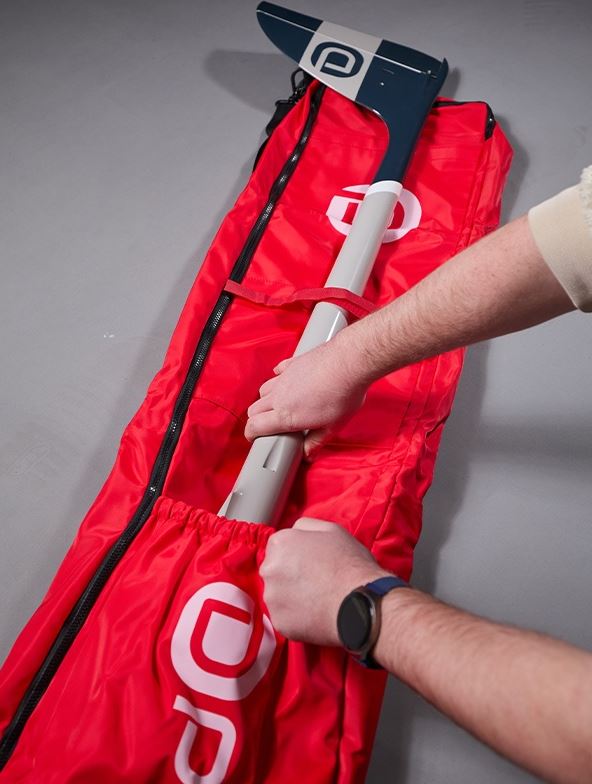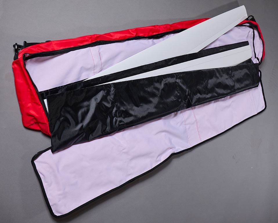 Die Flächen finden Platz in einem großen Einlegefach (ca. 140 x 34 cm), welches mit einem umlaufenden Reißverschluß verschlossen werden kann. Das Einlagefach ist so unterteilt, dass sich bis zu vier Flächenhälften während des Transports nicht berühren können und somit optimal geschützt sind.